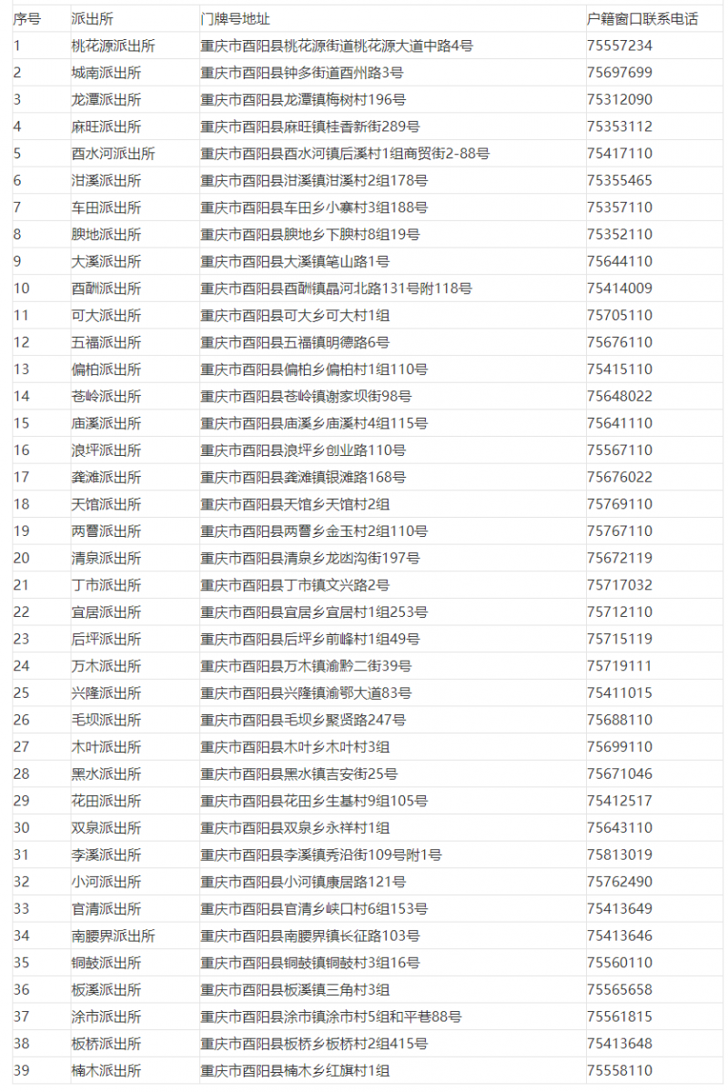 重庆市酉阳县辖区派出所户籍窗口联系电话和门牌号地址大全表:联系电话的区号为023.