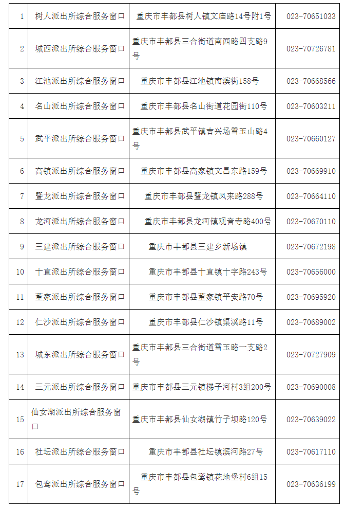 重庆市丰都县辖区派出所户籍窗口地址电话信息大全表:为方便广大人民群众办理户籍户政业务,满足群众办户办证需要,现将丰都县辖区派出所户籍窗口联系电话及办公地址公布如下,需要办理业务的群众可咨询预约办理。