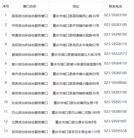 免责声明:关于重庆市城口县辖区派出所户籍业务窗口联系电话和地址汇总表的信息作出免责声明,信息来源于城口县政府主管部门网站公开之内容,整理转载此文是出于传递更多便民服务信息之目的。若有来源标注错误或者其它差错或侵犯了您的合法权益,请与本网站联系,我们将及时更正、删除。以上内容如有变更,以相关部门的更新内容为主。谢谢。