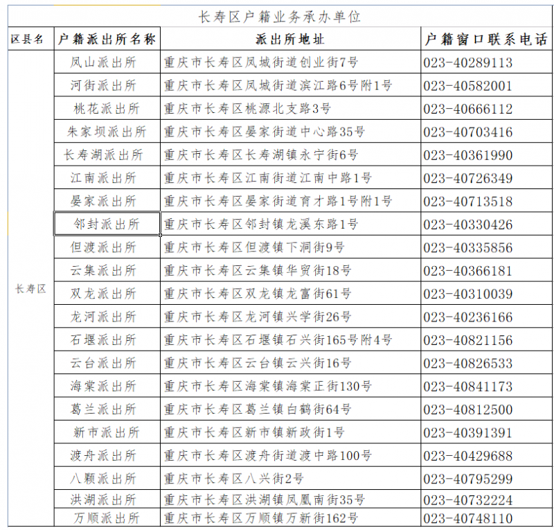 重庆市长寿区辖区户籍派出所名称地址及窗口联系电话大全表: 想您所想、急您所急,费尽心思、倾情用力,为您整理了一套重庆市长寿区又新又全的户籍派出所电话和地址名录,极具收藏和使用价值,快快转给需要的小伙伴吧!