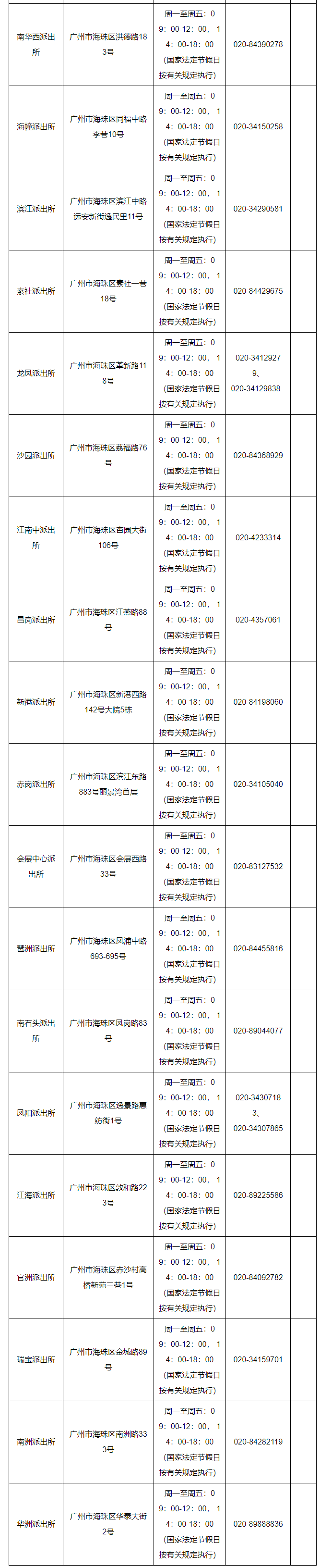 提示:关于广州市海珠区辖区派出所对外服务电话大全表的信息作出免责提示,信息来源于广州市海珠区政府主管部门网站公开之内容,整理转载此文是出于传递更多便民服务信息之目的。以上信息仅供参考,由于时间及其他方面的原因可能会发生变动,不准确之处请原谅!若有来源标注错误或者其它差错或侵犯了您的合法权益,请与本网站联系,我们将及时更正、删除。以上便民信息内容如有变更,以相关部门的更新内容为主。谢谢。