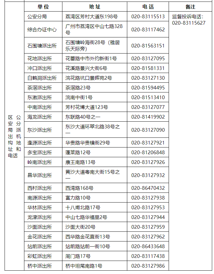 说明:关于广州市荔湾区辖区派出所地址电话大全表的信息作出免责说明,本信息仅为提供便民服务目的而发布,相关信息来源于广州市荔湾区政府主管机构网站之公开内容。本信息仅作参考,信息的准确性和完整性在此不作任何保证,也不保证所包含的信息和建议不会发生任何变更,我们仅对公开资料中的内容做原文提取或者整理转载。虽然已力求信息的客观完整,但随着时间与其它情况发生,难免信息出现差错或者变更。如果出现差错或者侵犯了您的权利,请通知本网站客服,我们将及时更正或者删除。谢谢。