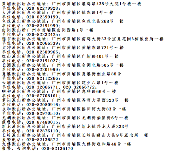 免责提示:关于广州市黄埔区辖区派出所地址电话信息大全表的信息作出免责提示,信息来源于广州市黄埔区政府主管部门网站公开之内容,整理转载此文是出于传递更多便民服务信息之目的。以上信息仅供参考,由于时间及其他方面的原因可能会发生变动,不准确之处请原谅!若有来源标注错误或者其它差错或侵犯了您的合法权益,请与本网站联系,我们将及时更正、删除。以上便民信息内容如有变更,以相关部门的更新内容为主。谢谢。