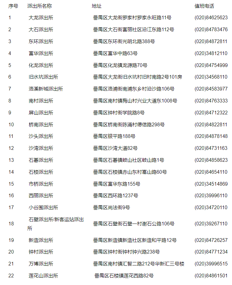 免责声明:关于广州市番禺区辖区派出所名称地址和值班电话大全表的信息作出免责声明,信息来源于广州市番禺区政府主管部门网站公开之内容,整理转载此文是出于传递更多便民服务信息之目的。以上信息仅供参考,由于时间及其他方面的原因可能会发生变动,不准确之处请原谅!若有来源标注错误或者其它差错或侵犯了您的合法权益,请与本网站联系,我们将及时更正、删除。以上便民信息内容如有变更,以相关部门的更新内容为主。谢谢。