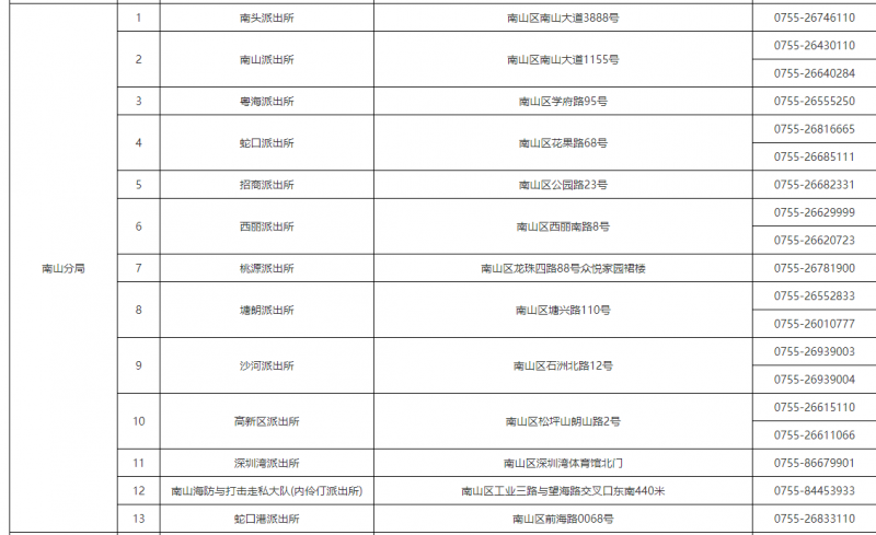 免责提示:关于深圳市南山区辖区派出所报警电话和详细地址大全表的信息作出免责提示,本信息仅为提供便民服务目的而发布,相关信息来源于深圳市政府主管机构网站之公开内容。本信息仅作参考,信息的准确性和完整性在此不作任何保证,也不保证所包含的信息和建议不会发生任何变更,我们仅对公开资料中的内容做原文提取或者整理转载。虽然已力求信息的客观完整,但随着时间与其它情况发生,难免信息出现差错或者变更。如果出现差错或者侵犯了您的权利,请通知本网站客服,我们将及时更正或者删除。谢谢。