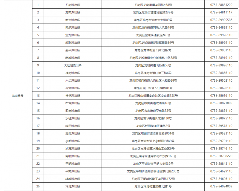 免责声明:关于广东深圳市龙岗区各派出所地址及值班电话号码大全表的信息作出免责声明,本信息仅为提供便民服务目的而发布,相关信息来源于深圳市政府主管机构网站之公开内容。本信息仅作参考,信息的准确性和完整性在此不作任何保证,也不保证所包含的信息和建议不会发生任何变更,我们仅对公开资料中的内容做原文提取或者整理转载。虽然已力求信息的客观完整,但随着时间与其它情况发生,难免信息出现差错或者变更。如果出现差错或者侵犯了您的权利,请通知本网站客服,我们将及时更正或者删除。谢谢。