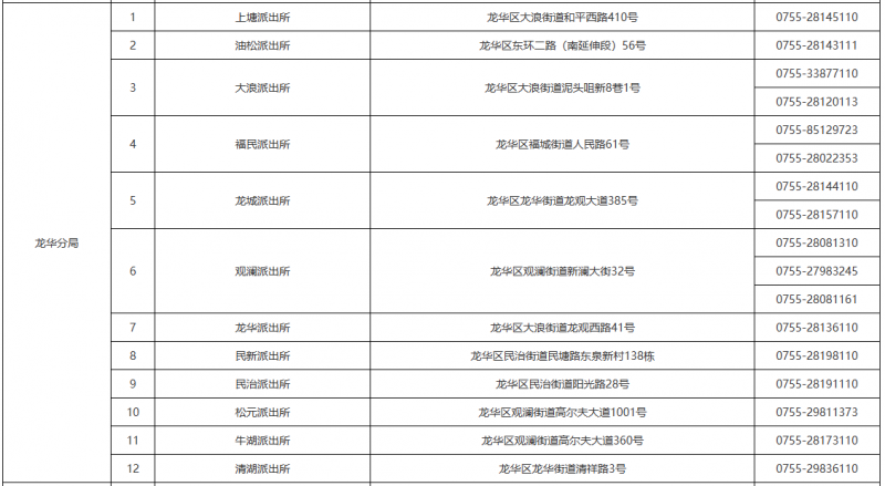 特别提示:关于深圳市龙华区各派出所地址及值班电话大全表的信息作出特别提示,信息来源于深圳市政府主管部门网站公开之内容,整理转载此文是出于传递更多便民服务信息之目的。以上信息仅供参考,由于时间及其他方面的原因可能会发生变动,不准确之处请原谅!若有来源标注错误或者其它差错或侵犯了您的合法权益,请与本网站联系,我们将及时更正、删除。以上便民信息内容如有变更,以相关部门的更新内容为主。谢谢。