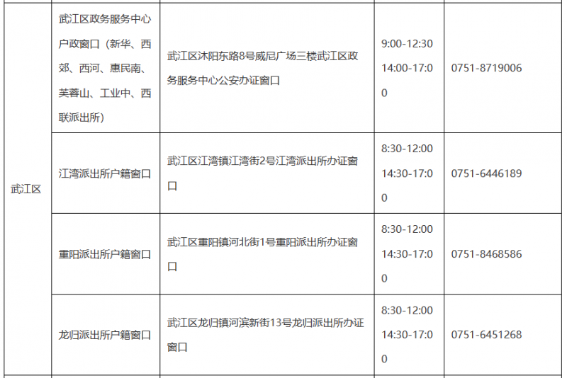 韶关市武江区辖区派出所户政窗口地址及咨询电话大全表: