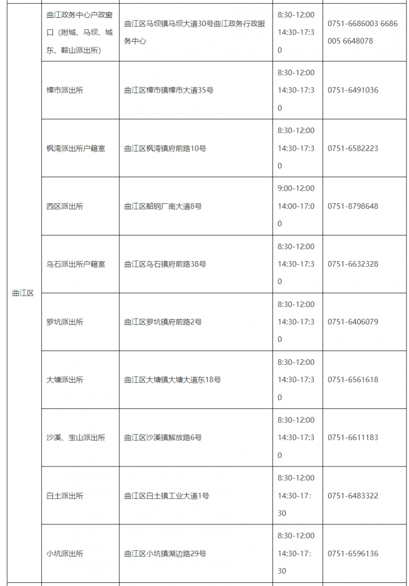 特别声明:关于韶关市曲江区辖区派出所和政务中心户政窗口咨询电话及地址汇总表作出特别声明,信息来源于韶关市政府主管部门网站公开之内容,整理转载此文是出于传递更多便民服务信息之目的。以上信息仅供参考,由于时间及其他方面的原因可能会发生变动,不准确之处请原谅!若有来源标注错误或者其它差错或侵犯了您的合法权益,请与本网站联系,我们将及时更正、删除。以上便民信息内容如有变更,以相关部门的更新内容为主。谢谢。