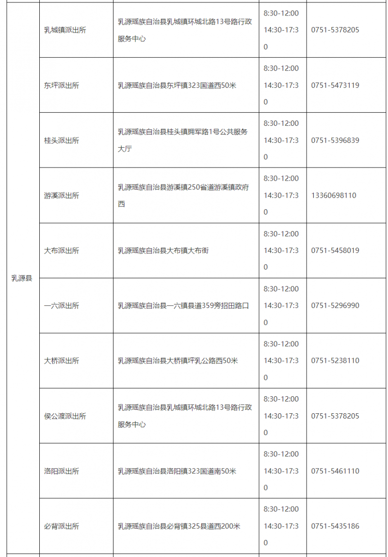 广东乳源瑶族自治县办理户政受理派出所窗口电话地址大全表:推进落实“优化窗口服务举措”,不断优化办事创业和企业营商环境,为广大人民群众提供优质高效服务,提高群众满意度,特此把乳源瑶族自治县办理户政业务受理点派出所窗口电话地址大全表向社会公开。以便为群众提供更好的服务。