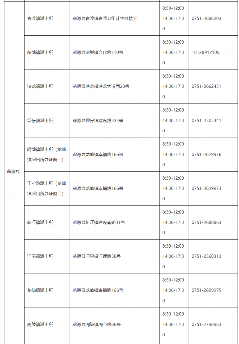 特别提示:关于韶关市翁源县办理户政派出所窗口业务咨询电话和地址大全表之信息作出特别提示,信息来源于韶关市政府主管部门网站公开之内容,整理转载此文是出于传递更多便民服务信息之目的。以上信息仅供参考,由于时间及其他方面的原因可能会发生变动,不准确之处请原谅!若有来源标注错误或者其它差错或侵犯了您的合法权益,请与本网站联系,我们将及时更正、删除。以上便民信息内容如有变更,以相关部门的更新内容为主。谢谢。