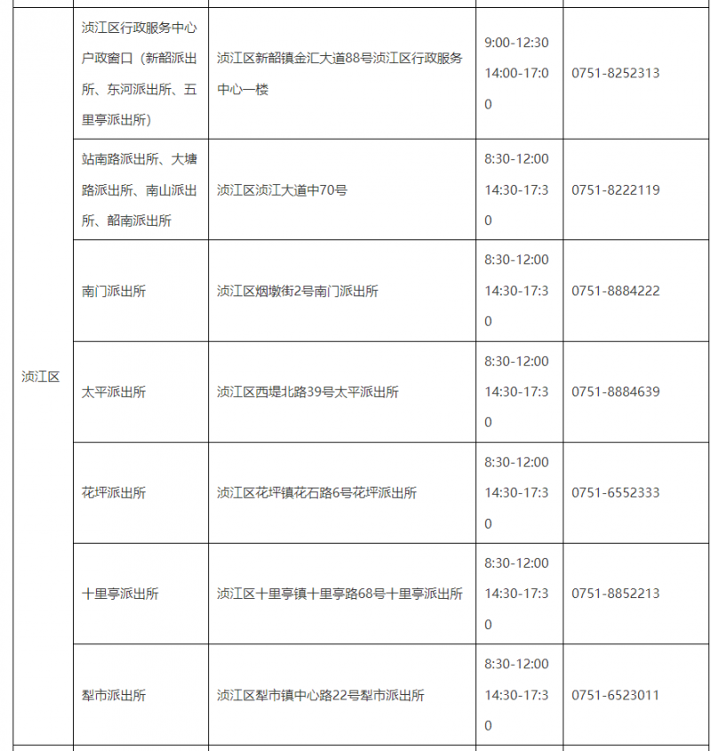 韶关市浈江区户政办理点(政务中心、派出所户政窗口)电话地址大全:
