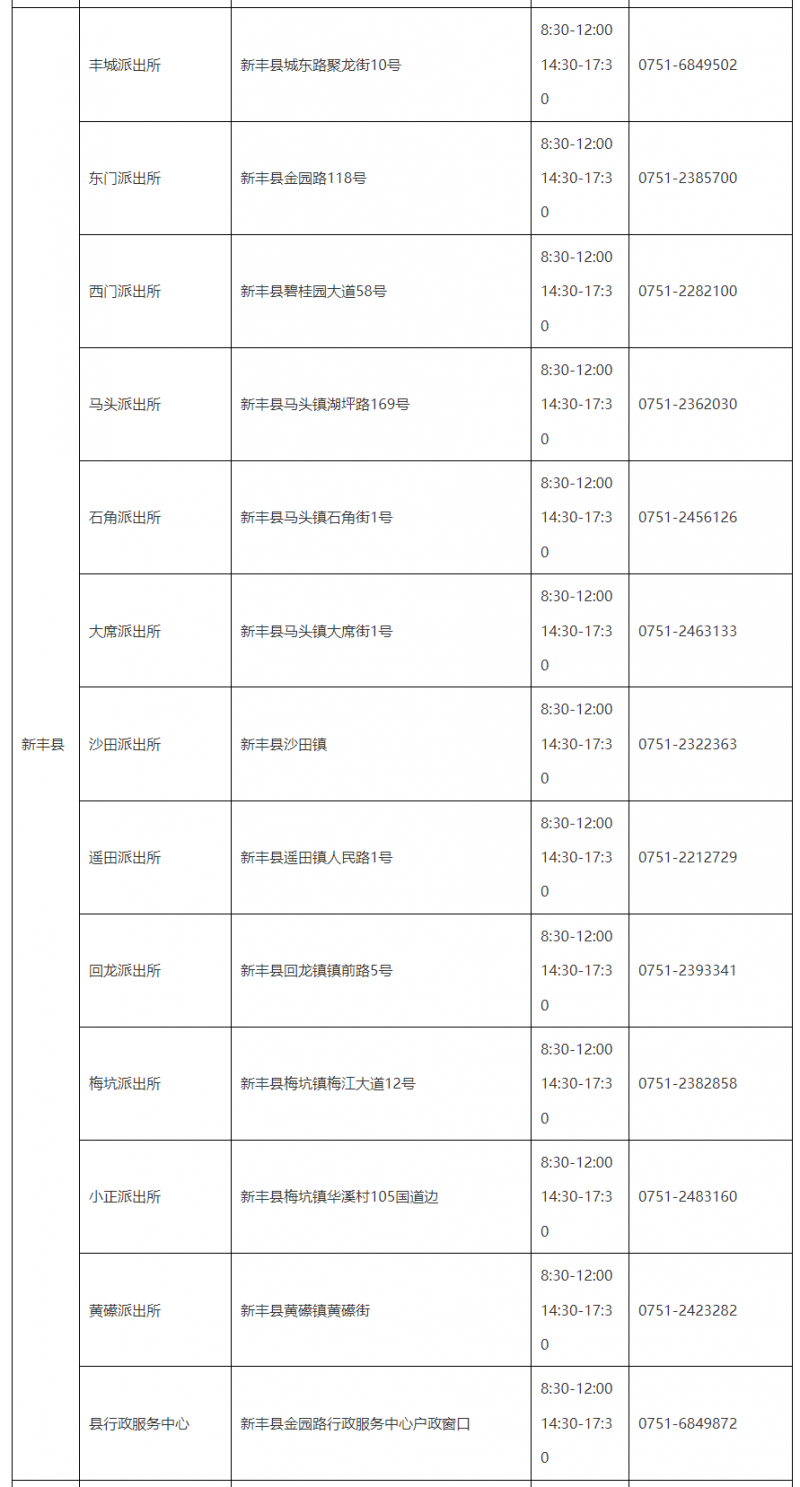 韶关市新丰县辖区户政办理点(政务中心、派出所户政窗口)电话地址大全: