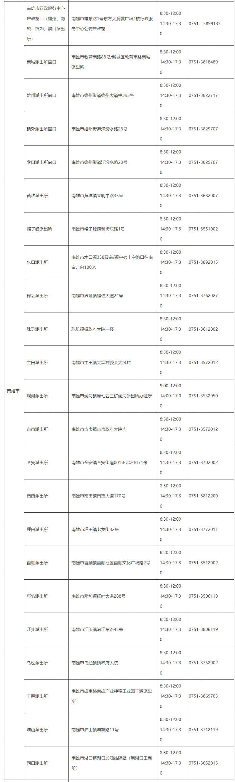 韶关南雄市辖区户政办理点(政务中心、派出所户政窗口)电话地址大全: