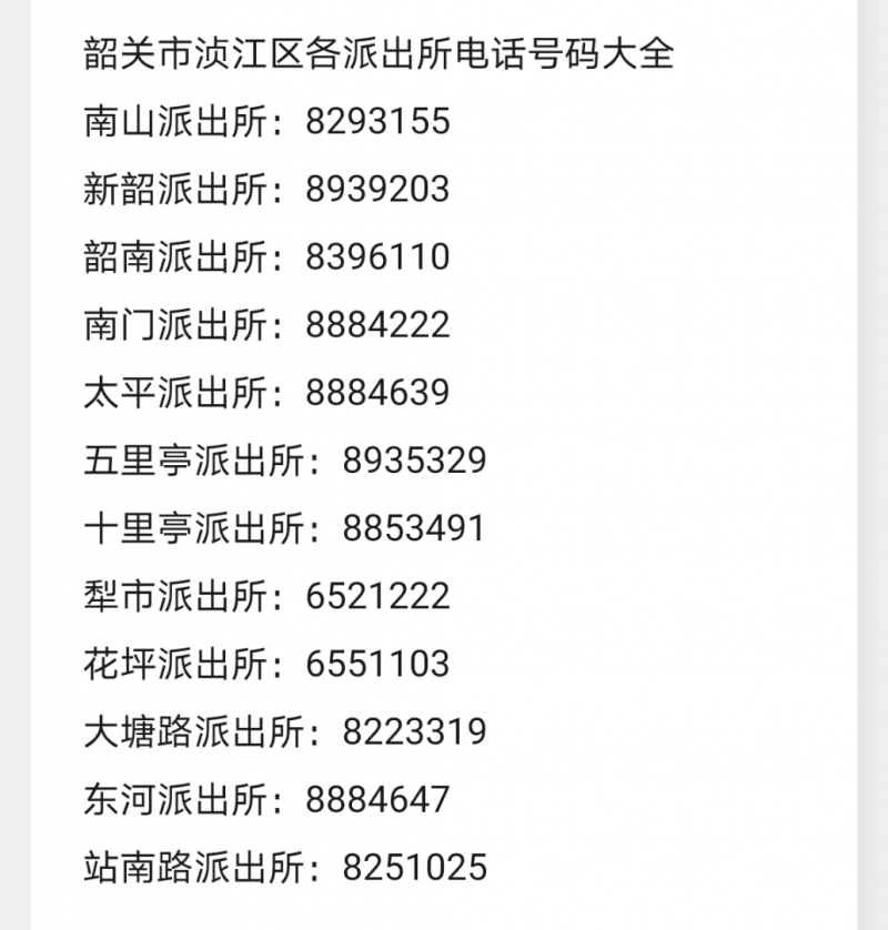 特别说明:关于韶关市浈江区各派出所电话号码大全表之信息作出特别说明,信息来源于韶关市浈江区政府主管部门公开之内容,整理转载此文是出于传递更多便民服务信息之目的。以上信息仅供参考,由于时间及其他方面的原因可能会发生变动,不准确之处请原谅!若有来源标注错误或者其它差错或侵犯了您的合法权益,请与本网站联系,我们将及时更正、删除。以上便民信息内容如有变更,以相关部门的更新内容为主。谢谢。