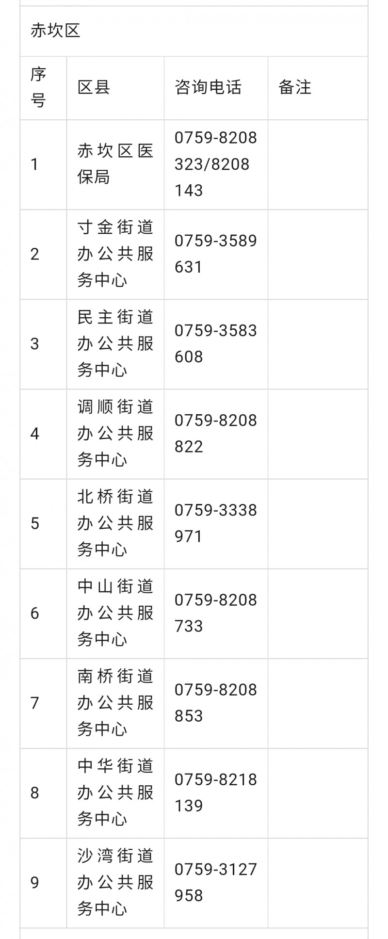 湛江市赤坎区城乡居民医保参保工作咨询电话号码大全表: