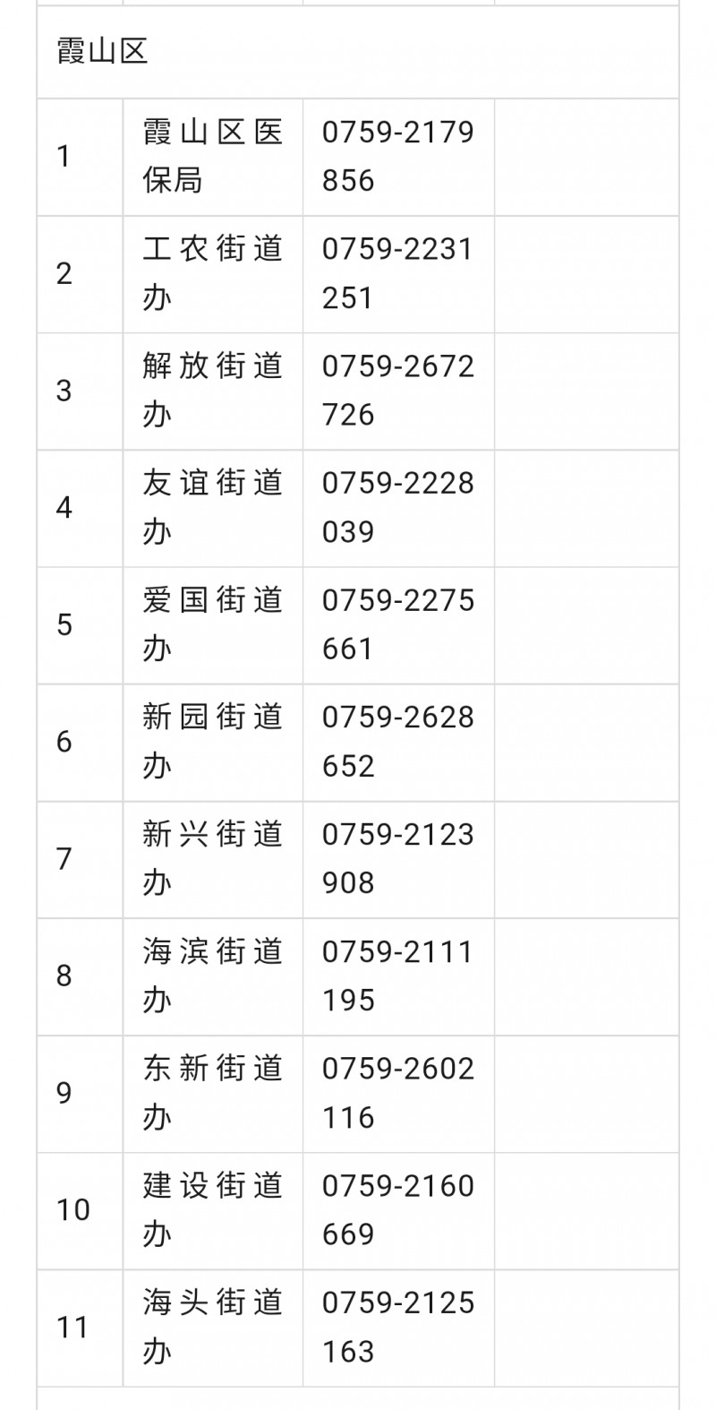 湛江市霞山区城乡居民医保参保工作咨询电话号码大全表: