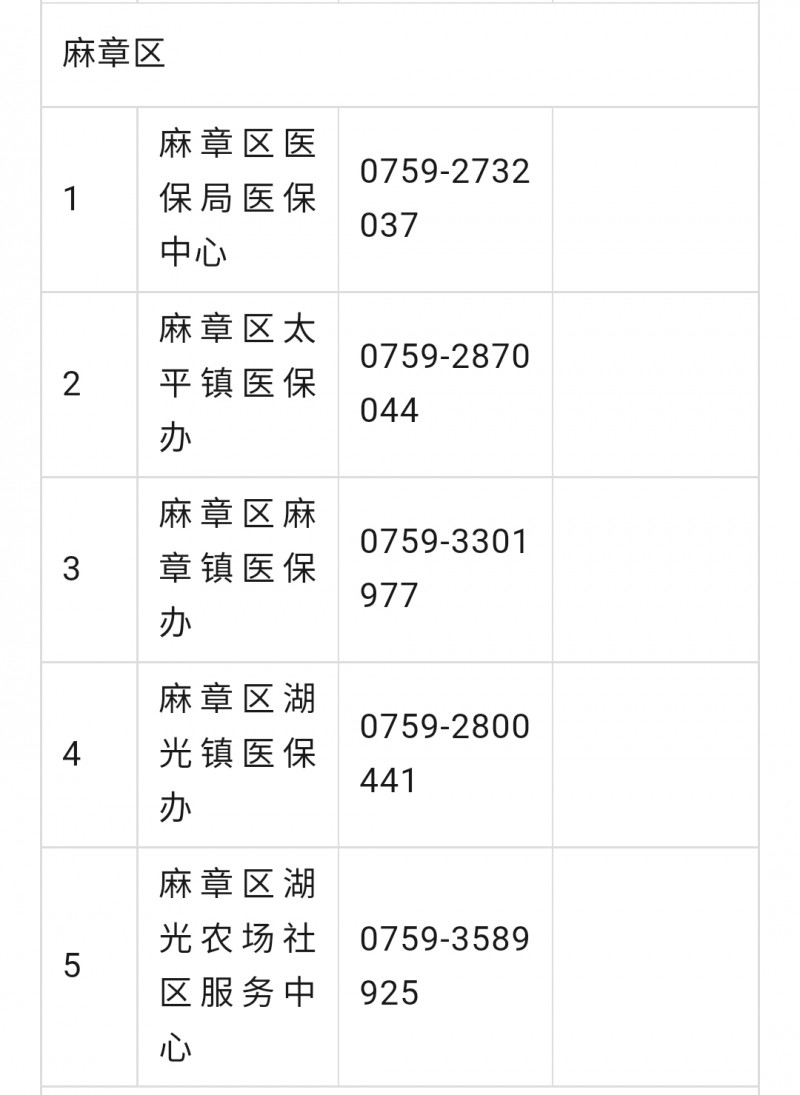 湛江市麻章区城乡居民医保参保工作咨询电话号码大全表: