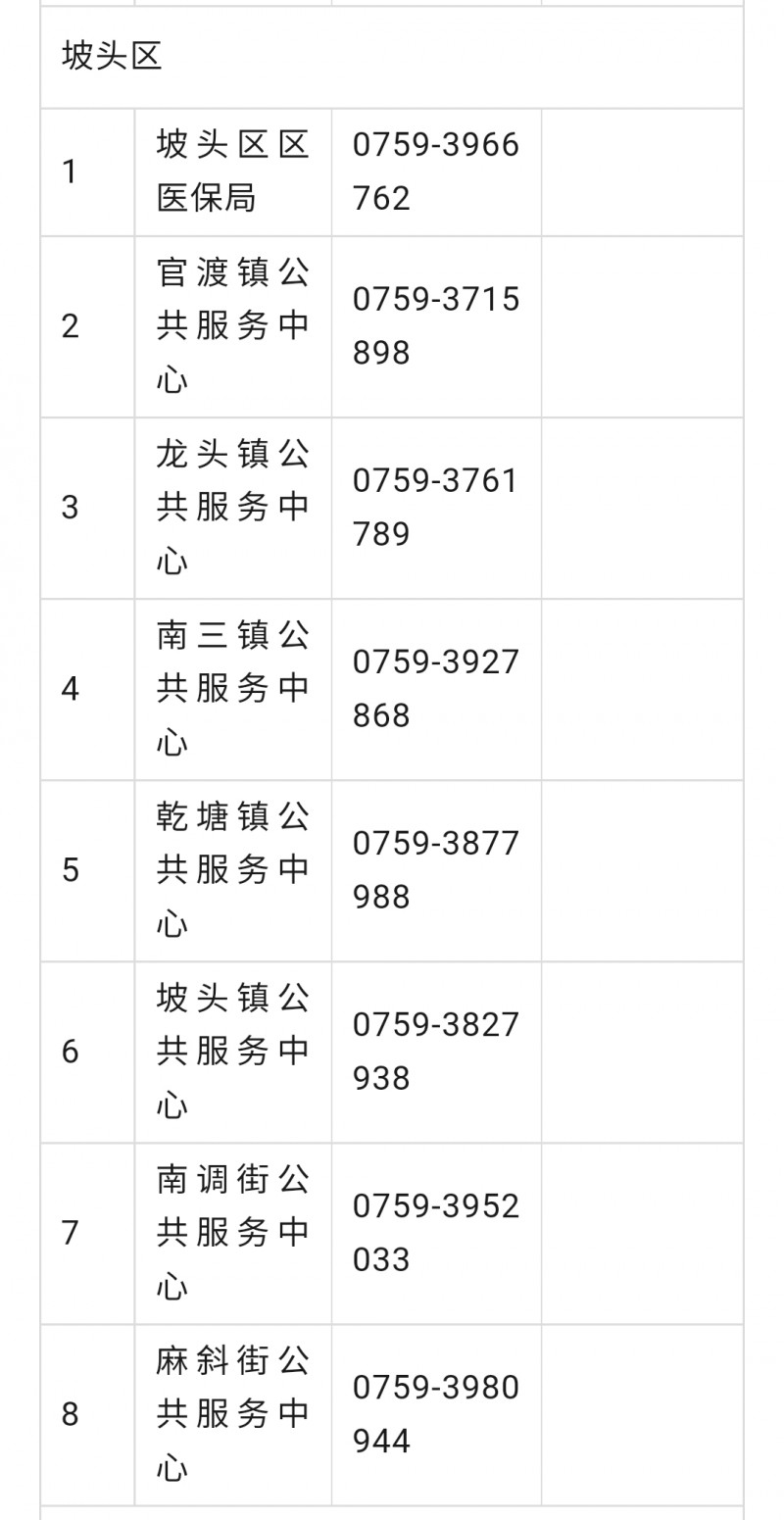 湛江市坡头区城乡居民医保参保工作咨询电话号码大全表: