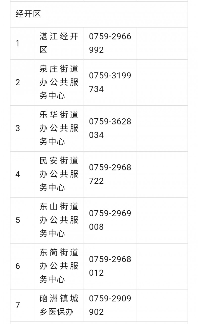 湛江市经开区城乡居民医保参保工作咨询电话号码大全表: