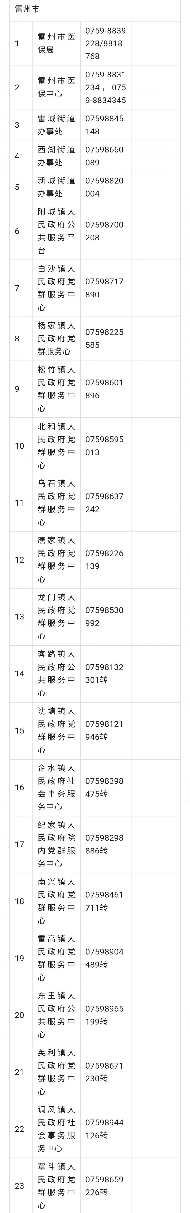 广东省湛江雷州市城乡居民医保参保工作咨询电话号码大全表: