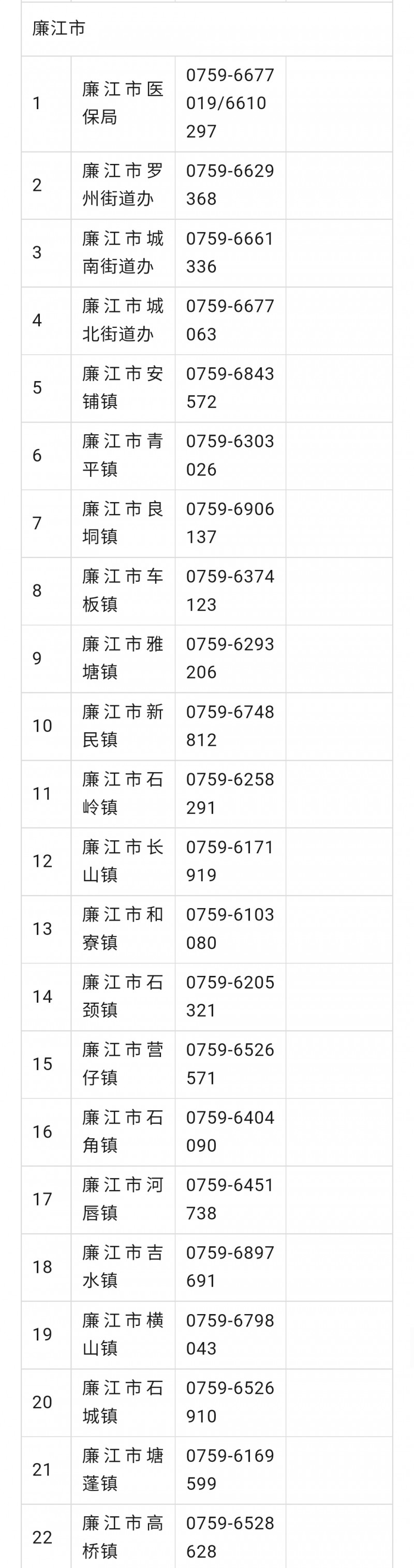 广东湛江廉江市城乡居民医保参保工作咨询电话号码大全表: