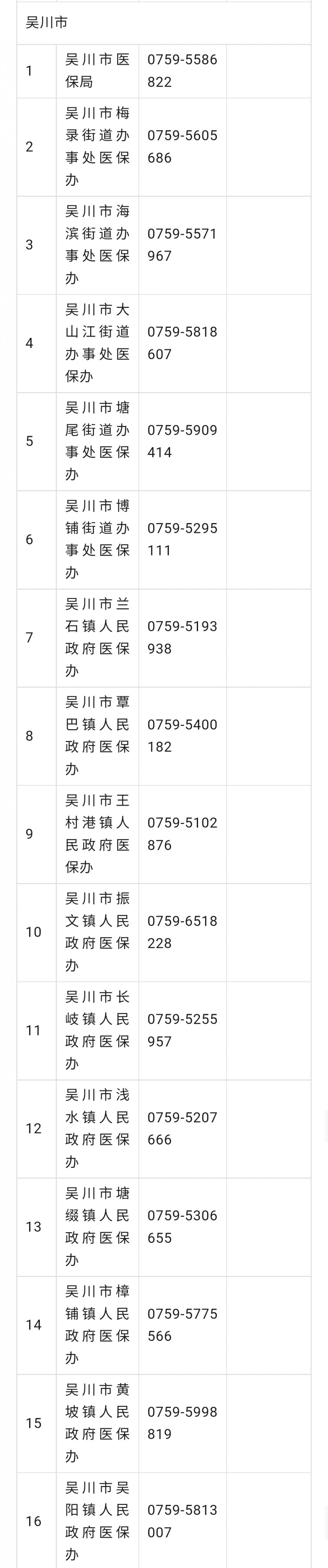 湛江吴川市城乡居民医保参保工作咨询电话号码大全表: