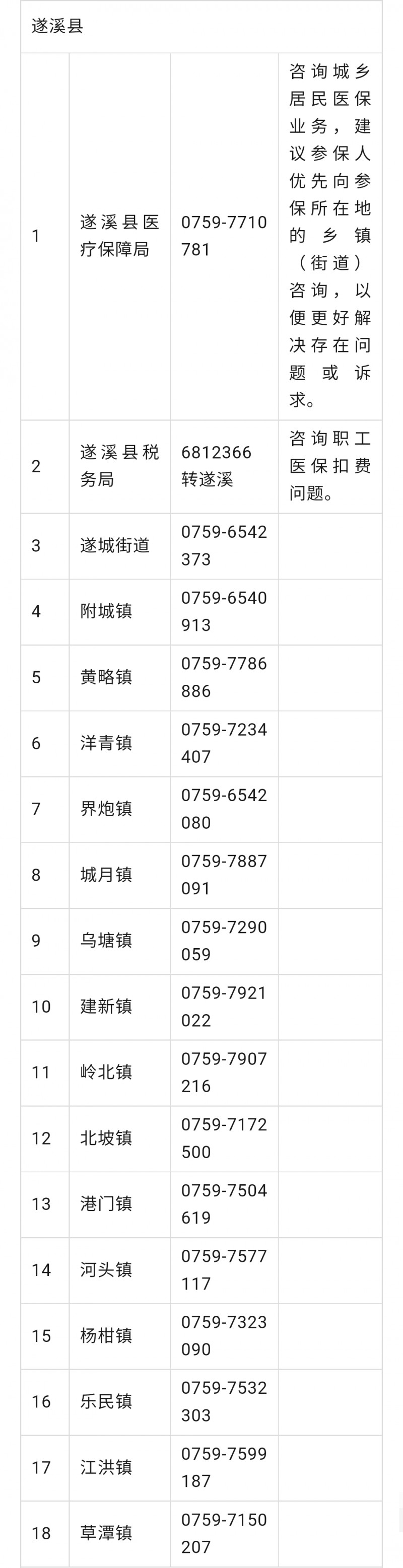 湛江市遂溪县城乡居民医保参保工作咨询电话号码大全表: