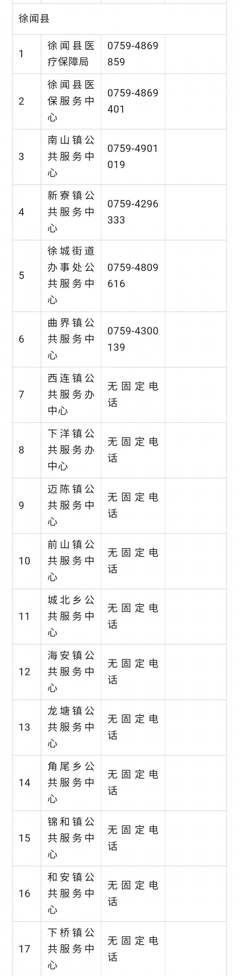 湛江市徐闻县城乡居民医保参保工作咨询电话号码大全表: