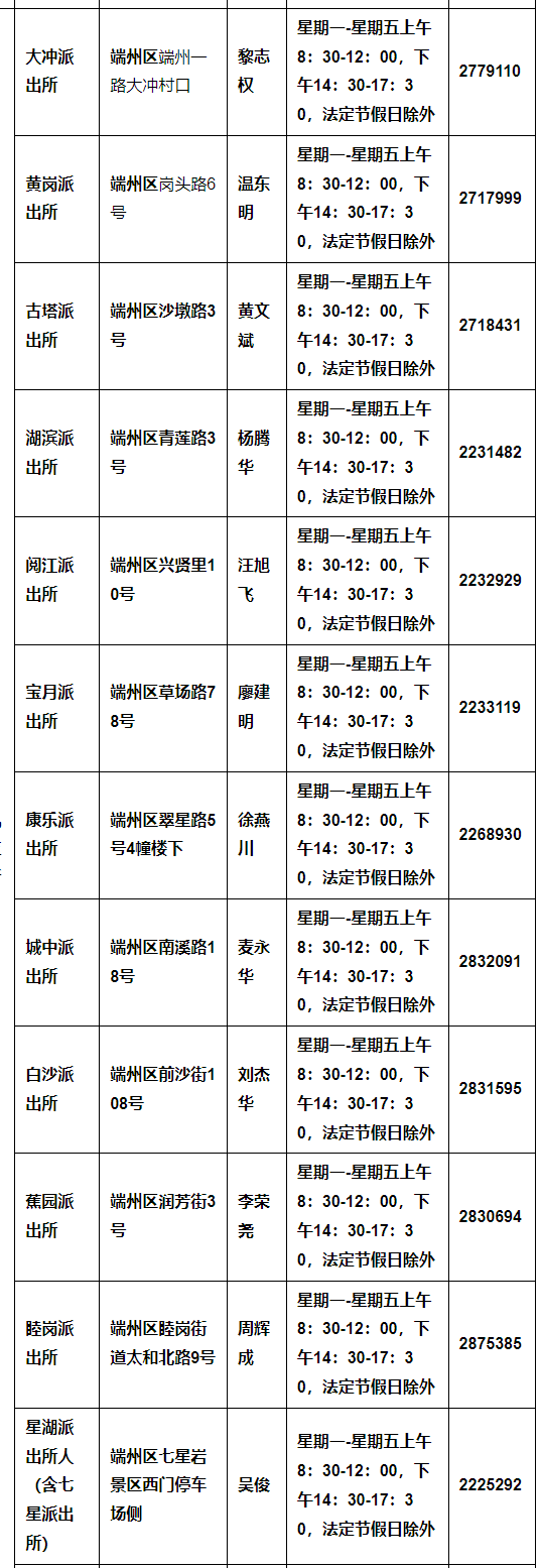 特别说明:关于肇庆市端州区辖区派出所办公地址和办公电话一览表之信息作出特别说明,信息来源于肇庆市端州区政府主管部门网站公开之内容,整理转载此文是出于传递更多便民服务信息之目的。以上信息仅供参考,由于时间及其他方面的原因可能会发生变动,不准确之处请原谅!若有来源标注错误或者其它差错或侵犯了您的合法权益,请与本网站联系,我们将及时更正、删除。以上便民信息内容如有变更,以相关部门的更新内容为主。谢谢。