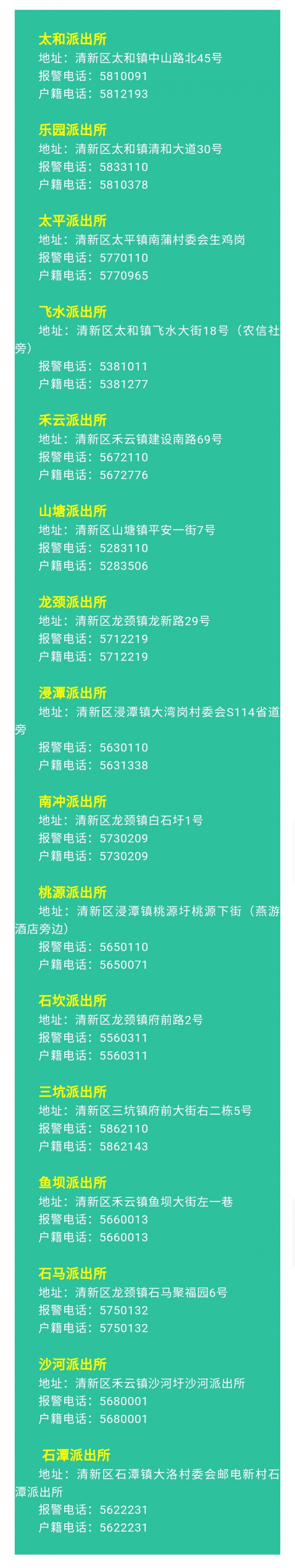说明:关于清远市清新区辖区派出所地址和报警电话户籍电话大全表之信息作出免责说明,本信息仅为提供便民服务目的而发布,相关信息来源于清远市清新区政府主管机构之公开内容。本信息仅作参考,信息的准确性和完整性在此不作任何保证,也不保证所包含的信息和建议不会发生任何变更,我们仅对公开资料中的内容做原文提取或者整理转载。虽然已力求信息的客观完整,但随着时间与其它情况发生,难免信息出现差错或者变更。如果出现差错或者侵犯了您的权利,请通知本网站客服,我们将及时更正或者删除。谢谢。