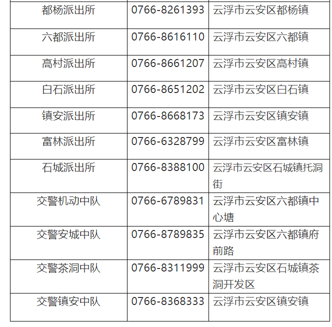 云浮市云安区各派出所和交警中队电话地址大全表:
