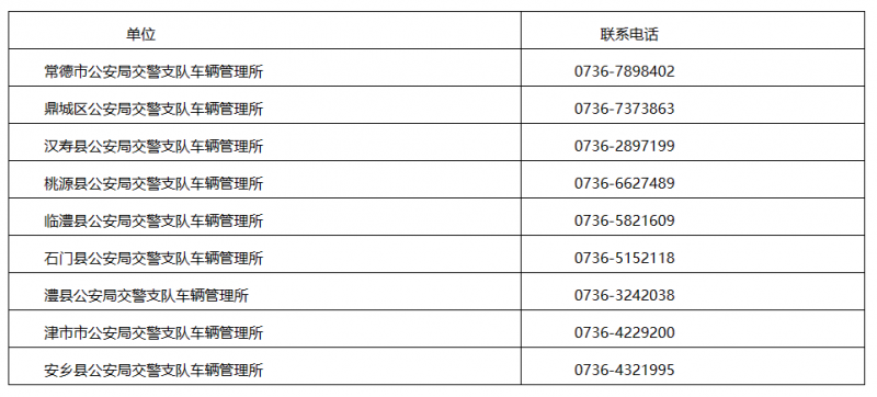 常德市全市辖区交警车辆管理所服务窗口联系电话大全表: