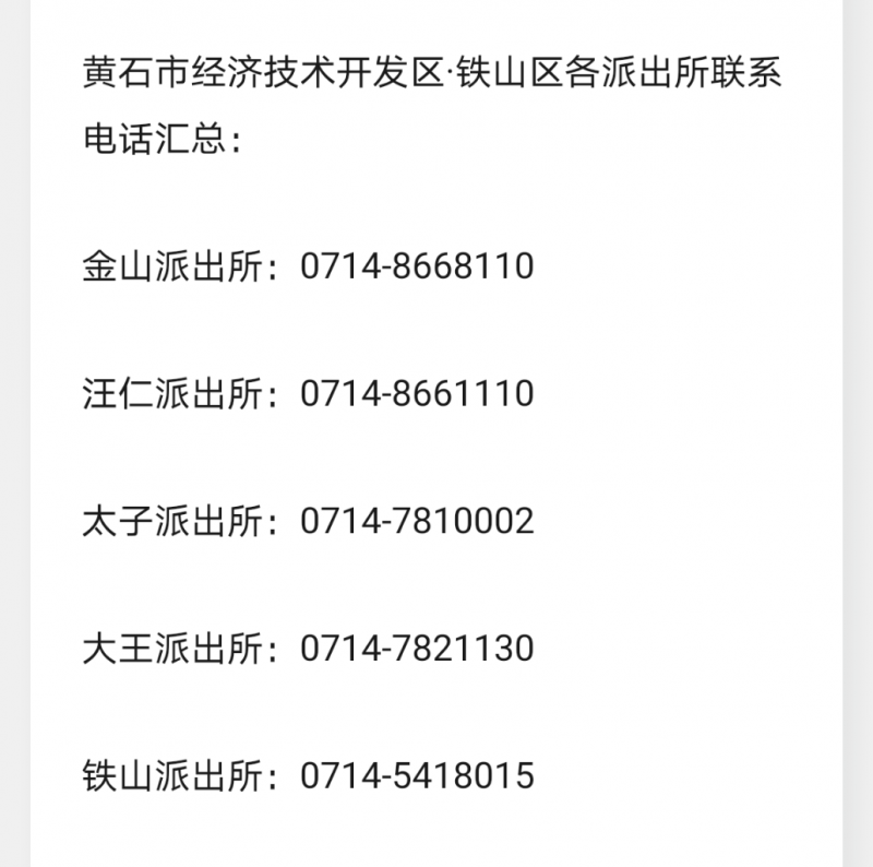 黄石市经济技术开发区.铁山区各派出所联系电话汇总之信息作出免责说明,本信息仅为提供便民服务目的而发布,相关信息来源于公开信息或第三方。本信息仅作参考,信息的准确性和完整性在此不作任何保证,也不保证所包含的信息和建议不会发生任何变更,我们仅对公开资料中的内容做原文提取或者整理转载。虽然已力求信息的客观完整,但随着时间与其它情况发生,难免信息出现差错或者变更。如果出现差错或者侵犯了您的权利,请通知本网站客服,我们将及时更正或者删除。谢谢。