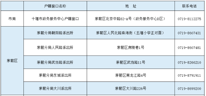 十堰市市局政务中心户籍窗口和茅箭区各派出所户籍窗口咨询电话和窗口地址大全表: