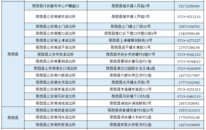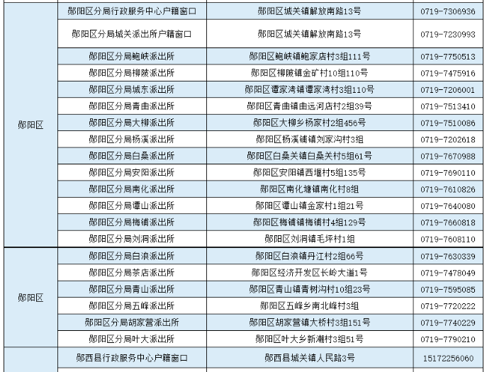 十堰市郧阳区各派出所户籍窗口咨询电话和窗口地址大全表: