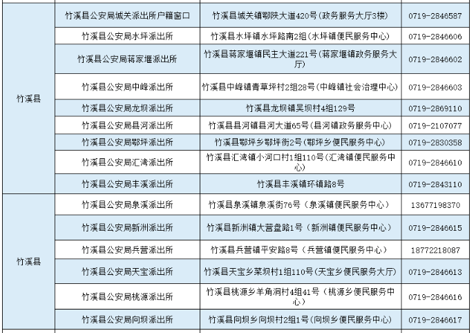 十堰市竹溪县各派出所户籍窗口咨询电话和窗口地址大全表: