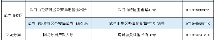 十堰市武功山特区和回龙分局派出所户籍窗口咨询电话和窗口地址大全表: