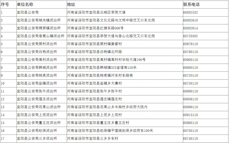 洛阳市宜阳县辖区派出所地址及联系电话大全表:为切实践行群众路线,进一步强化为民服务意识、畅通为民服务渠道,扎实推进政务公开、便民服务,尽最大努力方便广大市民咨询政策、办事、反映诉求,现将宜阳县辖区派出所地址电话集中进行公示,以确保为群众提供及时便利和精准高效的服务。电话号码的区号为0379。
