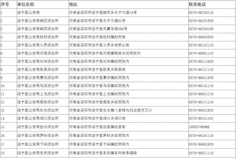 洛阳市洛宁县各派出所联系电话和单位地址信息汇总表:洛宁县各派出所将以热情地服务、快速地反应、高效地服务,全力提升人民群众安全感满意度。
