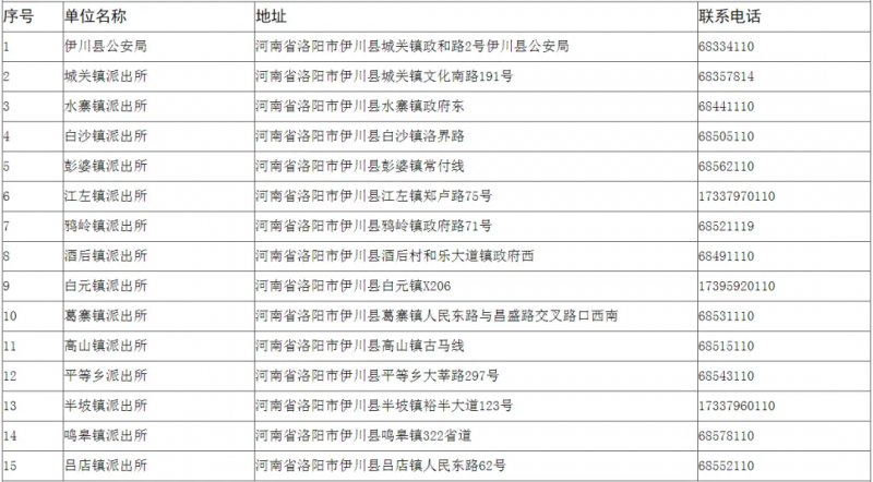 提示:关于洛阳市伊川县各派出所联系电话及办公地址一览表之信息作出免责提示,本信息来源自伊川县政府主管机构之公开内容,不代表本平台观点。我们致力于保护作者版权,分享有价值的内容。收集转载引用仅以传播更多精彩信息为目的,如涉及侵权,请直接联系本平台请求删除,谢谢!