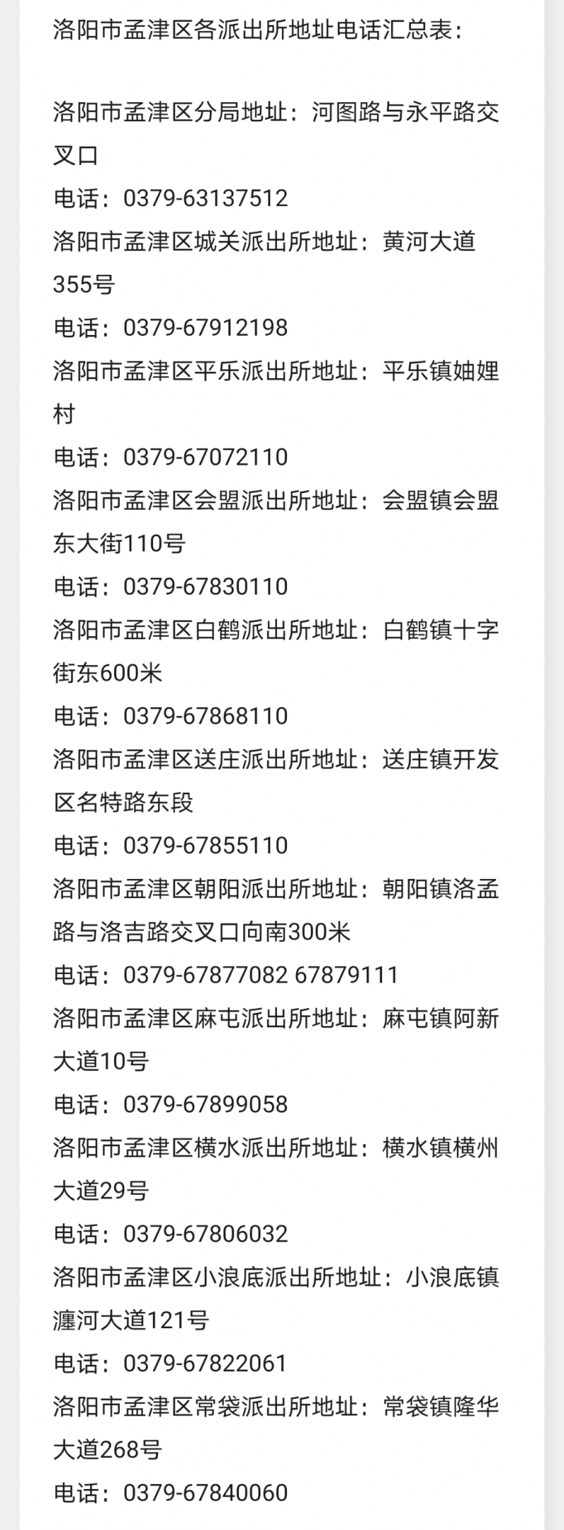 提示:关于洛阳市孟津区辖区派出所地址及电话汇总表之信息作出免责提示,信息来源于当地主管部门公开之内容,整理转载此文是出于传递更多便民服务信息之目的。以上信息仅供参考,由于时间及其他方面的原因可能会发生变动,不准确之处请原谅!若有来源标注错误或者其它差错或侵犯了您的合法权益,请与本网站联系,我们将及时更正、删除。以上便民信息内容如有变更,以相关部门的更新内容为主。谢谢。
