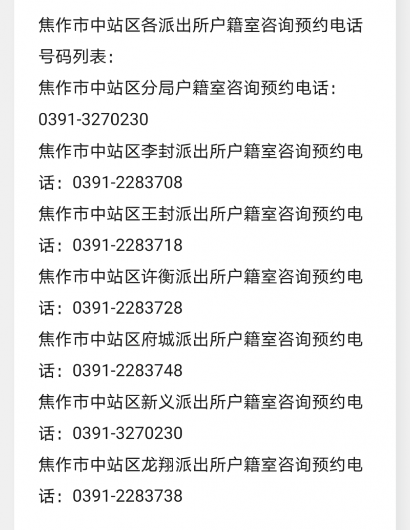 焦作市中站区各派出所户籍室咨询预约电话号码列表:焦作市中站区分局户籍室、焦作市中站区李封派出所户籍室、焦作市中站区王封派出所户籍室、焦作市中站区许衡派出所户籍室、焦作市中站区府城派出所户籍室、焦作市中站区新义派出所户籍室、焦作市中站区龙翔派出所户籍室。