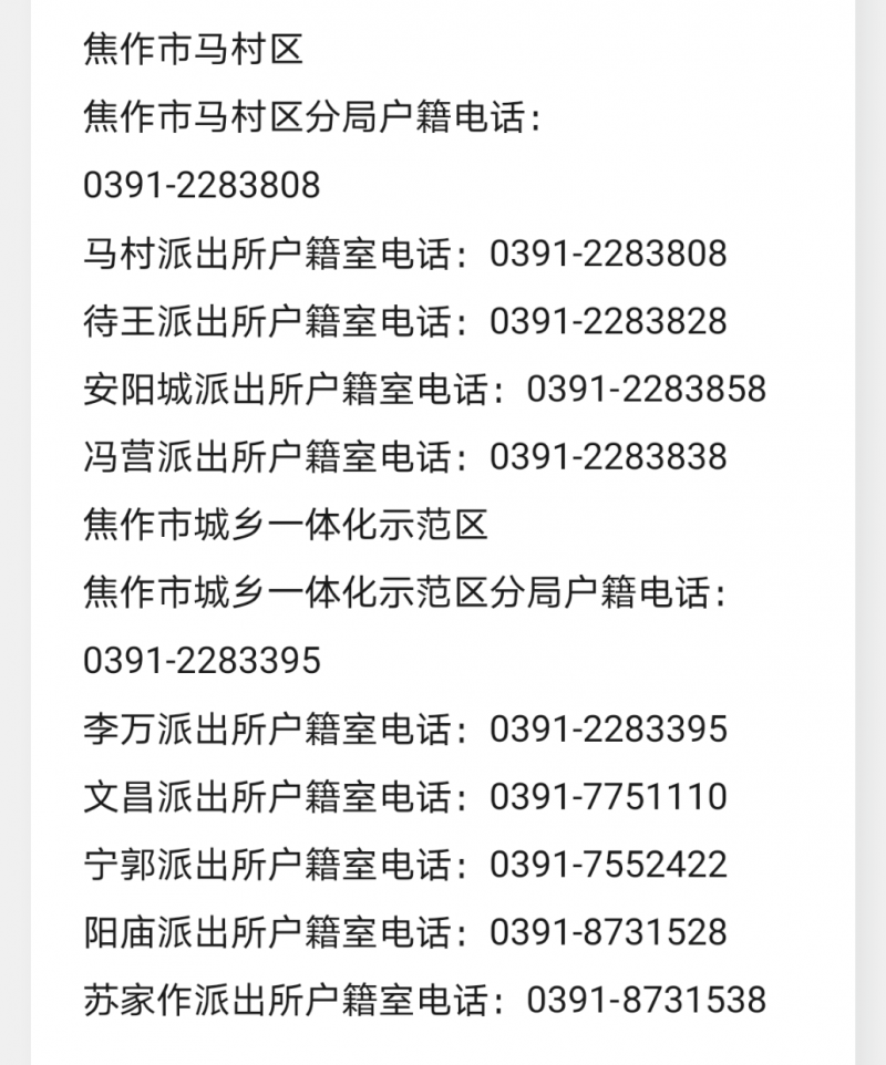 焦作市马村区和城乡一体化示范区辖区派出所户籍室电话汇总表: