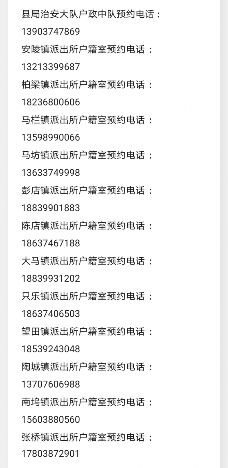 鄢陵县辖区派出所户籍室业务预约服务电话汇总表:县局治安大队户政中队、安陵镇派出所户籍室、柏梁镇派出所户籍室、马栏镇派出所户籍室、马坊镇派出所户籍室、彭店镇派出所户籍室、陈店镇派出所户籍室、大马镇派出所户籍室、只乐镇派出所户籍室、望田镇派出所户籍室、陶城镇派出所户籍室、南坞镇派出所户籍室、张桥镇派出所户籍室。