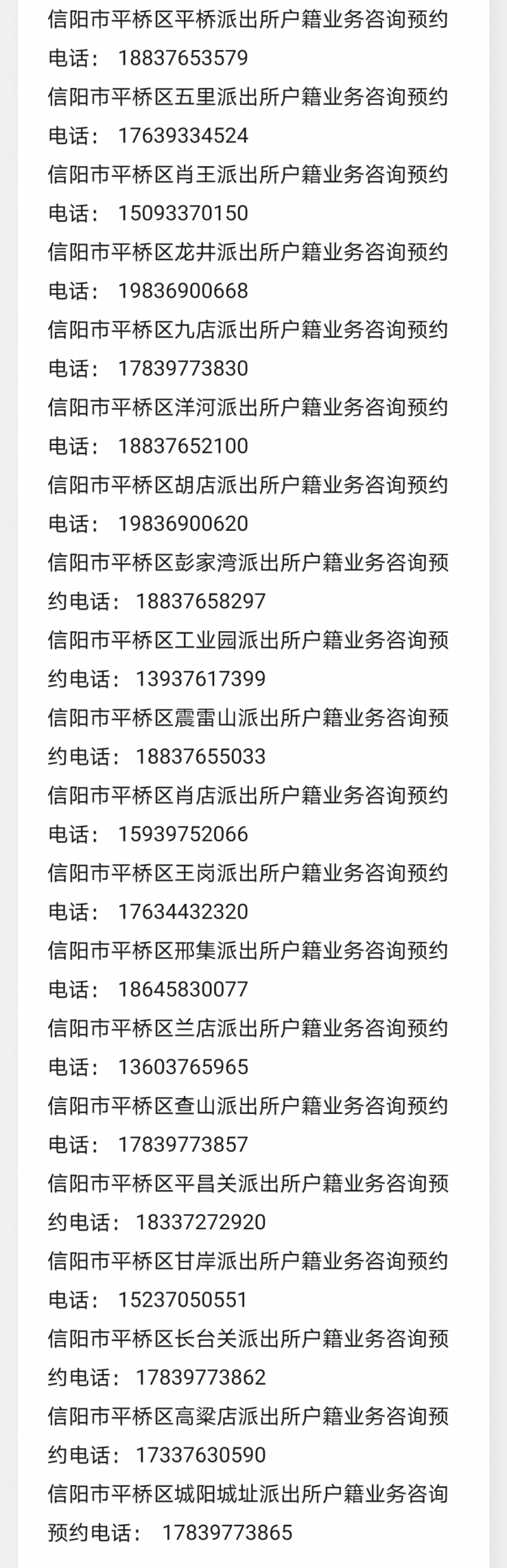 信阳市平桥区辖区各派出所户籍咨询预约电话号码大全表:为最大限度满足群众办理户籍、身份证业务需求,信阳市平桥区辖区各派出所户籍窗口实行办理户籍、身份证业务预约服务。现将户籍窗口名称、联系电话公布如下,办事群众可向户籍工作人员咨询办理事项并预约办理。