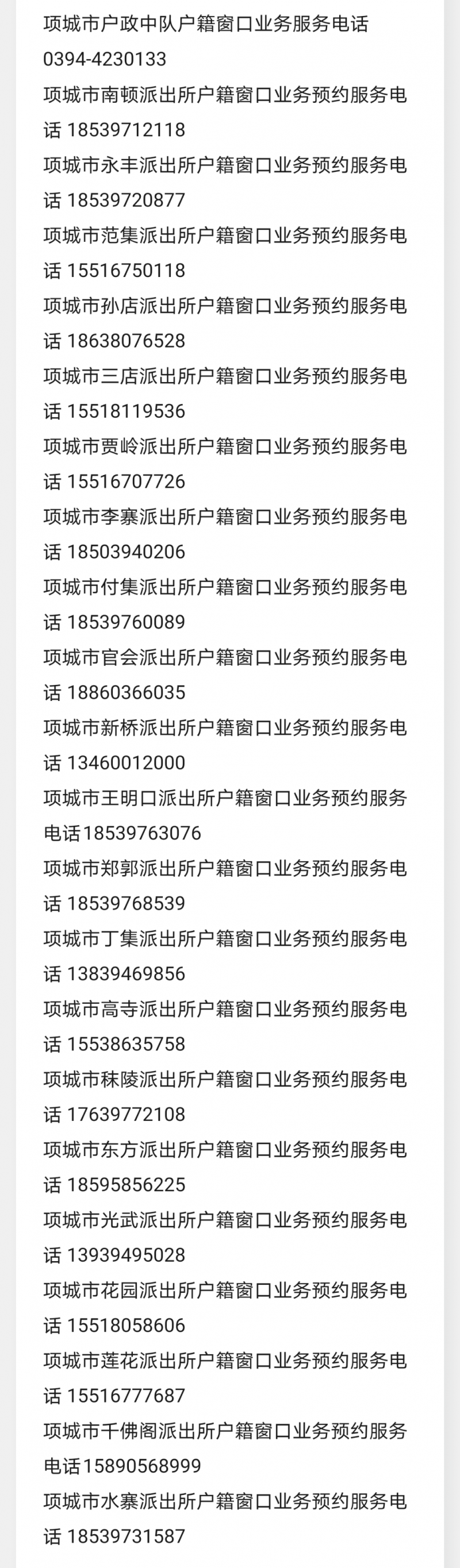 项城市辖区派出所户籍窗口预约服务电话列表:项城市户政中队户籍窗口、项城市南顿派出所户籍窗口、项城市永丰派出所户籍窗口、项城市范集派出所户籍窗口、项城市孙店派出所户籍窗口、项城市三店派出所户籍窗口、项城市贾岭派出所户籍窗口、项城市李寨派出所户籍窗口、项城市付集派出所户籍窗口、项城市官会派出所户籍窗口、项城市新桥派出所户籍窗口、项城市王明口派出所户籍窗口、项城市郑郭派出所户籍窗口、项城市丁集派出所户籍窗口、项城市高寺派出所户籍窗口、项城市秣陵派出所户籍窗口、项城市东方派出所户籍窗口、项城市光武派出所户籍窗口、项城市花园派出所户籍窗口、项城市莲花派出所户籍窗口、项城市千佛阁派出所户籍窗口、项城市水寨派出所户籍窗口。
