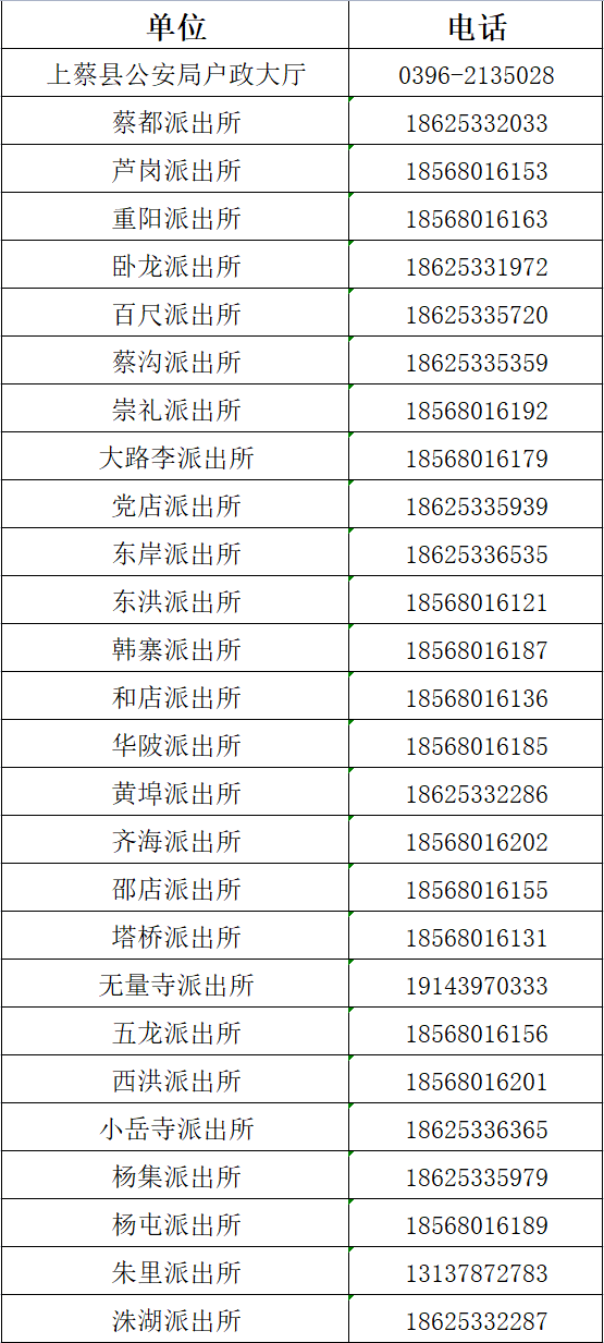 上蔡县辖区派出所户政业务咨询联系电话汇总表:为更高效、更便捷的服务群众,上蔡县对基层派出所户政业务电话号码进行了整理汇总,现面向社会予以公开,方便辖区群众第一时间咨询办理业务。