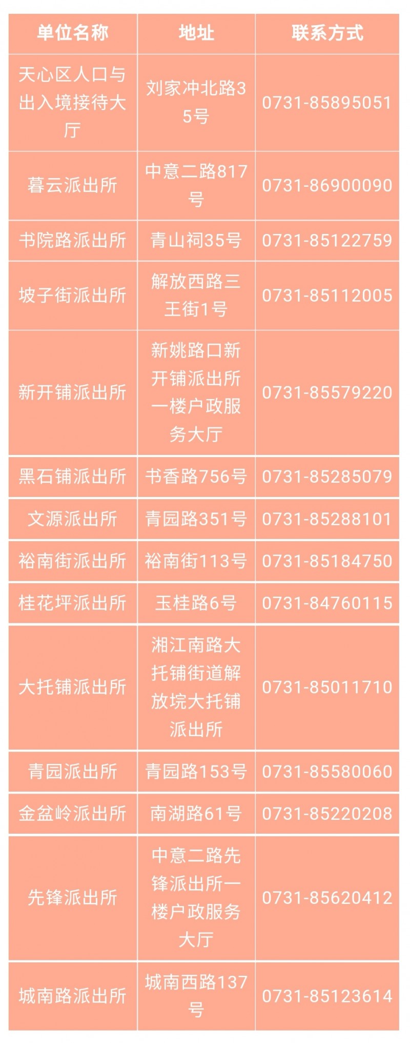 长沙市天心区辖区派出所户政业务窗口地址及联系方式大全表: