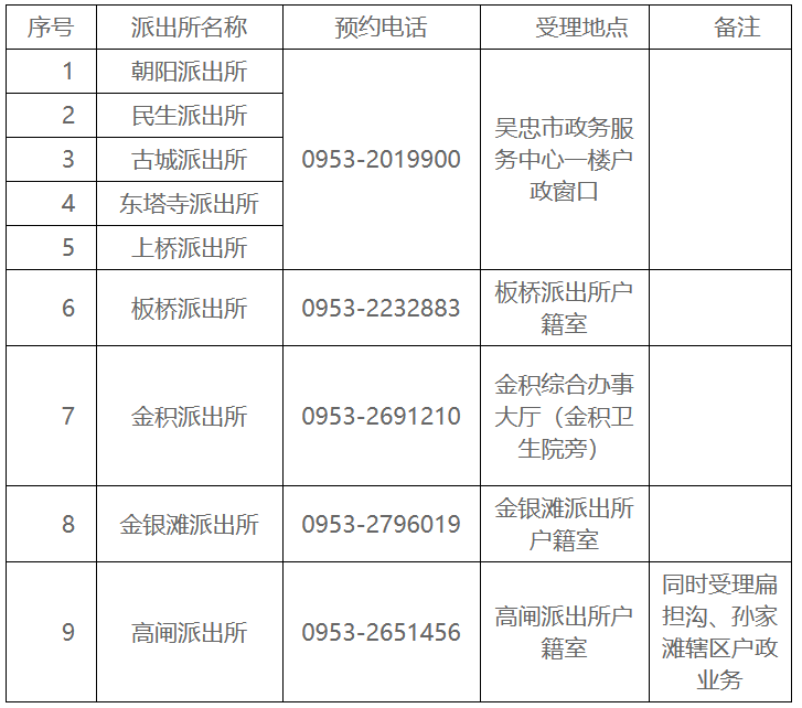吴忠市利通区辖区派出所户政业务窗口咨询预约电话一览表